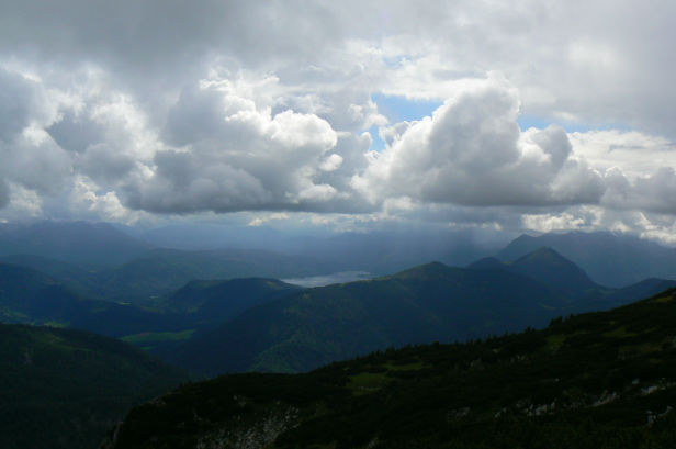 Auf dem Gipfel kamen nur noch 28 Wanderer und 3 Bergführer zeitgleich an. Der Rest war schon eine Stunde im Verzug. Das Wetter wurde jetzt zusehends besser und es ließ sich sogar die Sonne ab und an blicken. Wir konnten vom Gipfel der Benediktenwand aber noch Regenschauer im Voralpenraum sehen, insbesondere im Bereich des Starnberger und Ammersees.
