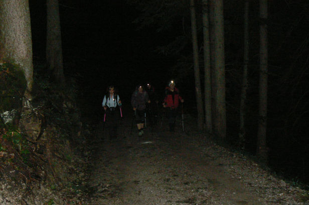 Nach der Suppe ohne Gulasch, einem alkoholfreien Weißbier und einer relativ kurzen Pause sind wir dann mit den 15 „bekloppten Gehern“ und 2 Bergführern im Licht der Stirnleuchten um 22:00 Uhr zur Kesselberghöhe (858m) abgestiegen, zwischen Kochel- und Walchensee). Von dort sind wir wieder sofort auf den Herzogstand aufgestiegen.