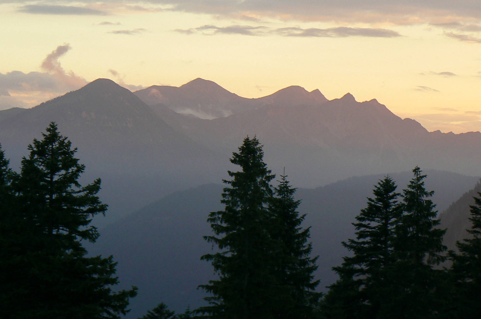 Gegen 04:30 Uhr ging es nun mit uns 10 „bekloppten“ Gehern und unserem Bergführer von der Heimgartenhütte hinunter ins Eschenlainetal (bei Eschenlohe). Auf dem Grat ins Tal begegnete uns eine ziemlich verstörte Schafherde, die mittlerweile mitten in der Nacht schon zum dritten Mal von “beleuchteten Bekloppten” von ihrem Lieblings-Kack- und Schlaf-Grat vertrieben wurden. Das Chefschaf beklagte sich lauthals und anhaltend bei der Flucht der Herde vor den „Bekloppten“ ins Unterholz. Mittlerweile graute uns der Morgen (im wahrsten Sinne des Wortes) und es wurde uns ein toller Sonnenaufgang präsentiert.