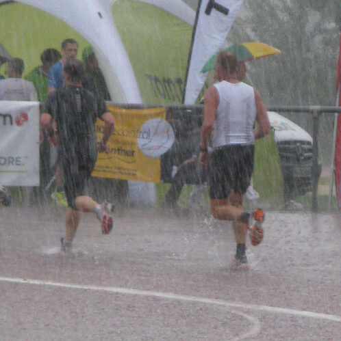 Der Lauf artete in einen Schwimmwettbewerb aus und als Zugabe standen die Feldwege tief unter einer braunen Brühe. Die letzten Meter auf der Laufbahn im Stadion glichen eher einem Schwimmwettbewerb, denn eines Laufevents. Hier waren Schwimmhäute, Badehose und -Kappe gefordert.