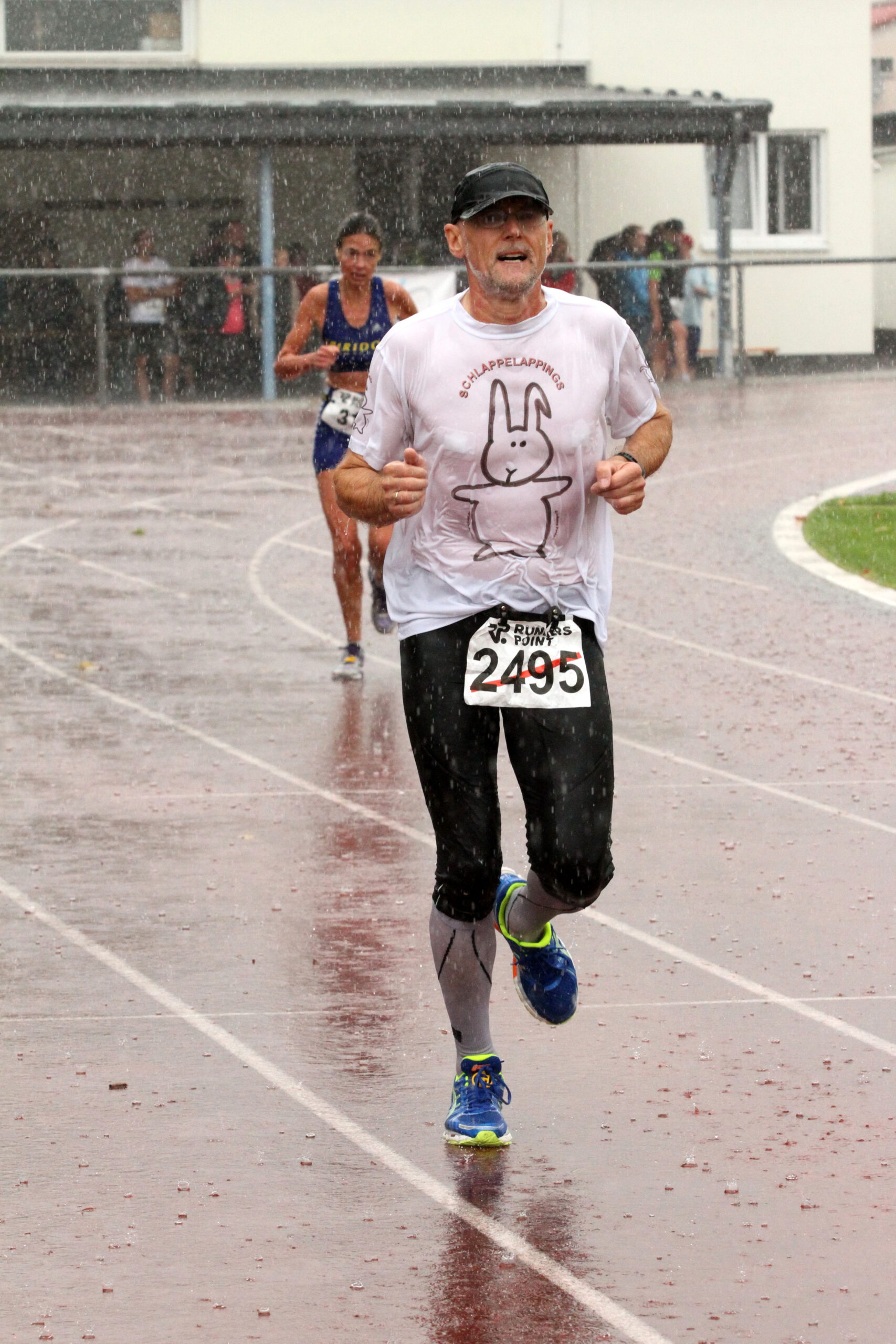 Der Lauf artete in einen Schwimmwettbewerb aus und als Zugabe standen die Feldwege tief unter einer braunen Brühe. Die letzten Meter auf der Laufbahn im Stadion glichen eher einem Schwimmwettbewerb, denn eines Laufevents. Hier waren Schwimmhäute, Badehose und -Kappe gefordert.