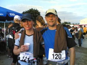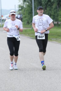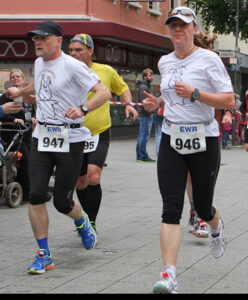 Siegbert hat die Jahresbestzeit von 1:37:01 gelaufen und Juliane schaffte es in der Hitze auf 1:52. Der Zieleinlauf wirkte nach den Strapazen nicht mehr ganz frisch, aber das kümmerte jeden Läufer nur wenig: „Hauptsache ohne Sanitäter ins Ziel gekommen“.