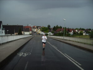 Das Gewitter war in Sichtweite, hielt sich aber vornehm zurück und platze außerhalb von Lampertheim nieder. Dadurch konnte der Lauf trocken beendet werden. Die Hitze blieb jedoch!