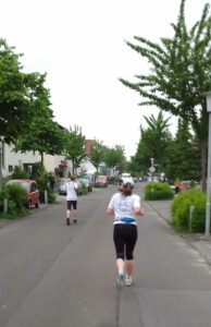 Nun zum Lauf: Bei gutem Laufwetter mit teilweise starkem böigen Wind in den Spargeläckern machten sich die Schlappelappings Juliane und Siegbert um 18:00 Uhr auf die Strecke. Schrittmacher und “Hase”